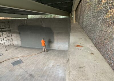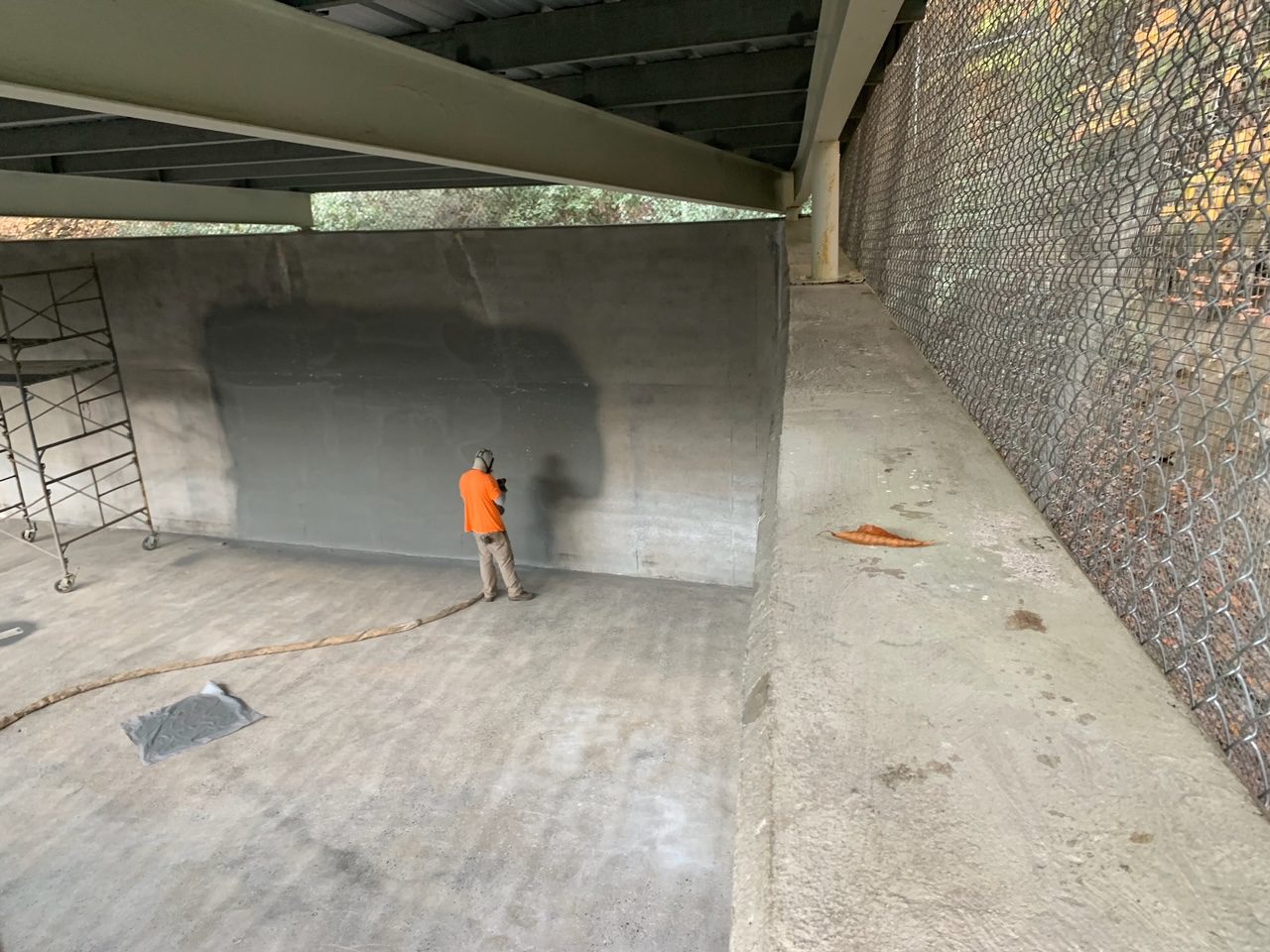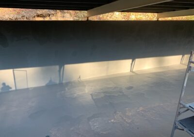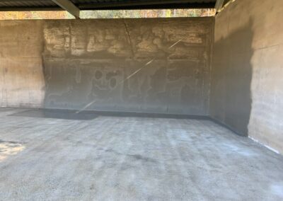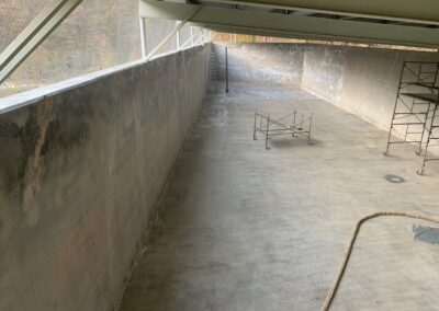 -Priming of concrete with concrete primer. Spraying of entire basin and over top of walls with 125 mil of Polyurea coating with an NSF61 rating.